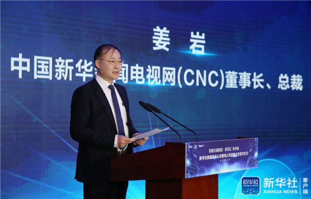 2月19日,新華社聯(lián)合搜狗公司在京發(fā)布全新升級的站立式AI合成主播并推出全球首個(gè)AI合成女主播。圖為中國新華新聞電視網(wǎng)有限公司(CNC)董事長、總裁姜巖致辭。新華社記者 肖磊濤 攝