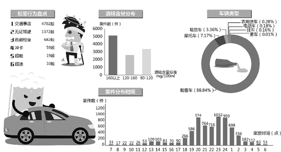 有11315起案件涉及醉駕。酒精含量160mg/100ml以上的居然有5088起案件。