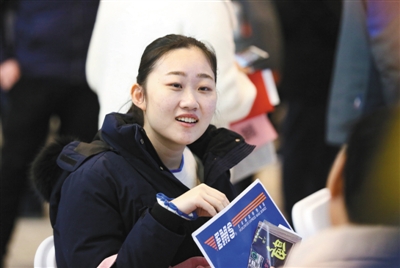 昨日,北京春季國展人才招聘會上,一名來應(yīng)聘的女士在與用人單位洽談。圖/視覺中國