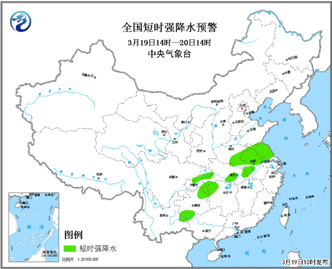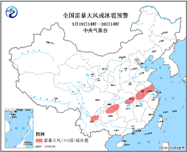 這次降雨過程中,會有明顯的雷電天氣。從19日夜間開始,河南南部、江蘇、安徽東北部、湖北北部、湖南西北部和貴州北部等地將先后出現(xiàn)雷電、短時(shí)強(qiáng)降水、雷暴大風(fēng)和冰雹等強(qiáng)對流天氣。19日10時(shí),中央氣象臺發(fā)布了強(qiáng)對流天氣藍(lán)色預(yù)警。