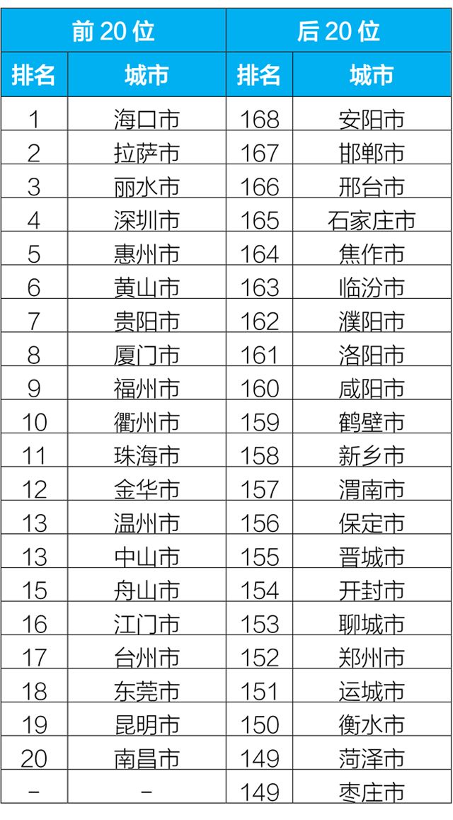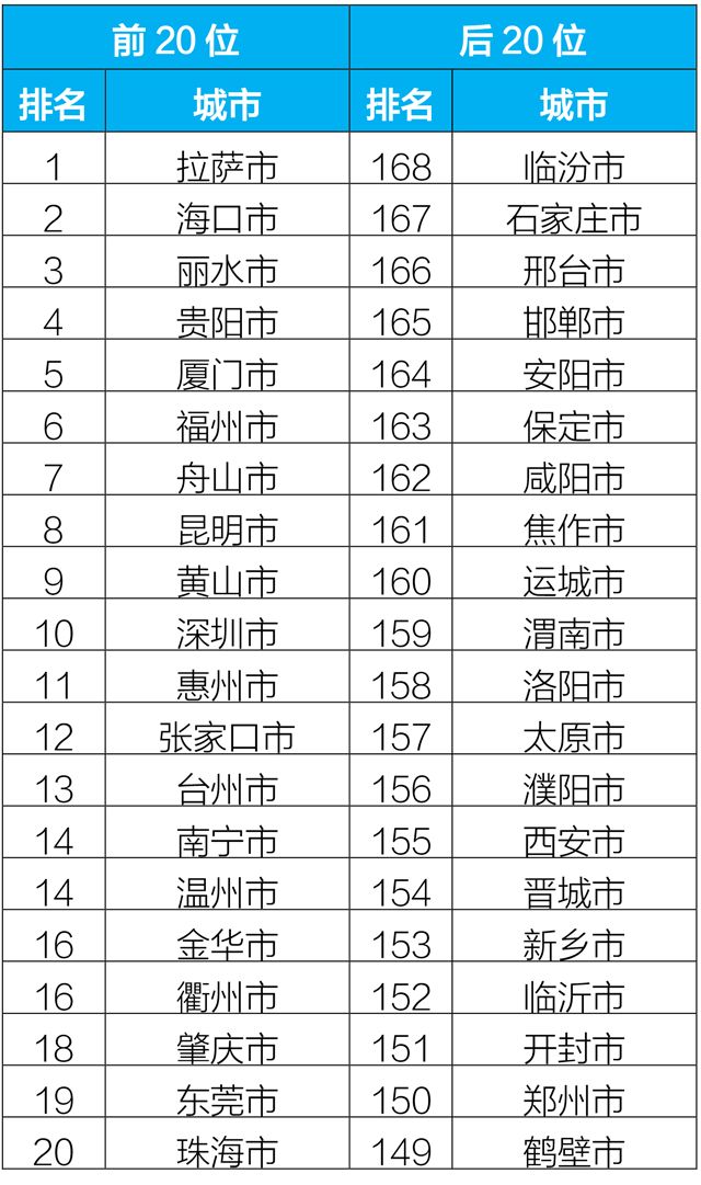 2019年2月168個重點(diǎn)城市排名前20位和后20位城市名單