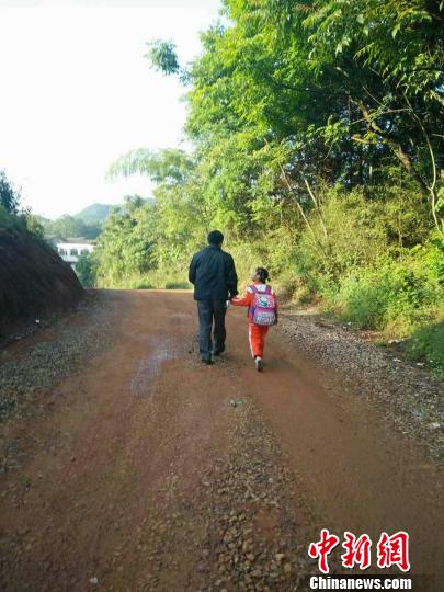 愛心志愿者康雄牽著“事實孤兒”去上學(xué)的背景?!¢L沙市岳麓區(qū)大愛無疆公益文化促進(jìn)會供圖 攝