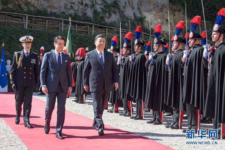 習(xí)近平抵達(dá)時(shí),孔特總理在停車處迎接。軍樂團(tuán)奏中意兩國國歌。兩國領(lǐng)導(dǎo)人一同檢閱儀仗隊(duì)。