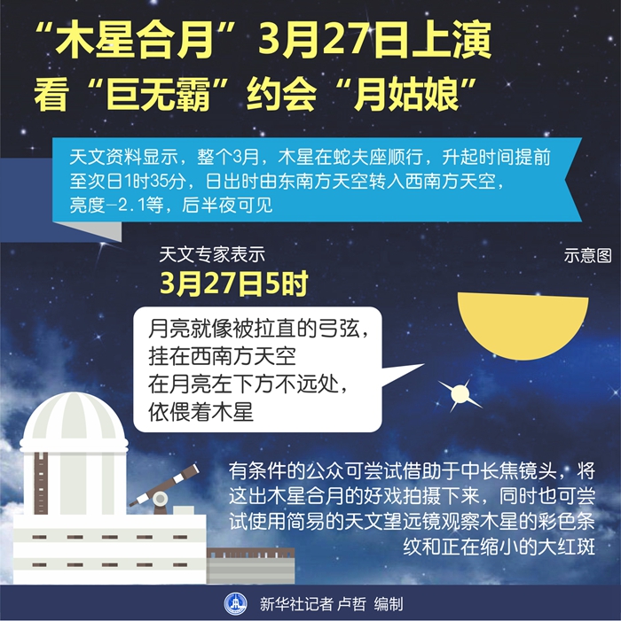 “有條件的公眾可嘗試借助于中長焦鏡頭,將這出木星合月的好戲拍攝下來,同時也可嘗試使用簡易的天文望遠(yuǎn)鏡觀察木星的彩色條紋和正在縮小的大紅斑。”趙之珩提醒說。