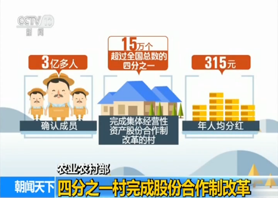 最新數(shù)據(jù)顯示,目前,全國農(nóng)村集體經(jīng)濟組織年收入達到4627億元,年經(jīng)營收益超過5萬元的村接近30%。其中,完成集體經(jīng)營性資產(chǎn)股份合作制改革的村有15萬個,超過全國總數(shù)的四分之一,確認(rèn)成員有3億多人,年人均分紅315元。