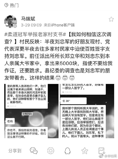3月28日23時46分,舉報家鄉(xiāng)村官貪腐的柔道冠軍馬端斌通過個人實名認證的微博發(fā)消息稱,其父親深夜被不明身份人員帶走,一時聯(lián)系不上父親,打電話一直沒人接,擔心其因為自己舉報的事情被為難。