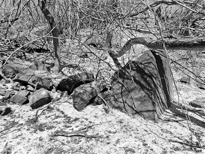 過(guò)火后的山石被燒成焦黑色。攝影/記者 董振杰
