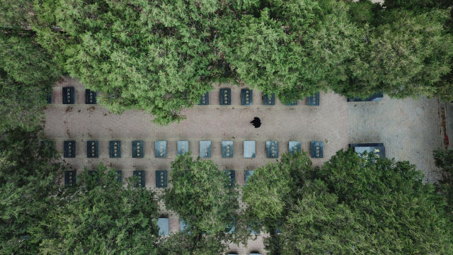 3月21日,張景憲走在張和莊烈士陵園內(無人機拍攝)。