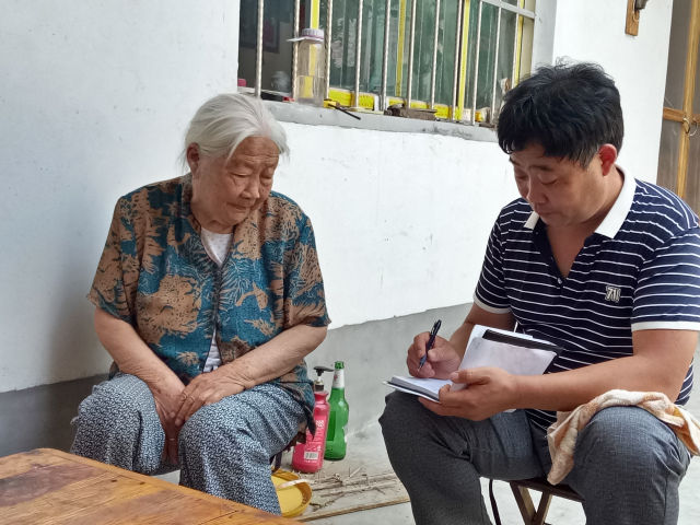 張景憲(右)在山東省新泰市與徐彥墩烈士的嫂子和尚云交談(2016年6月21日攝)。 新華社發(fā)(吉文選 攝)