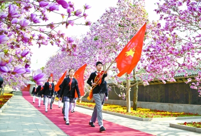 昨天,在八寶山革命公墓,少年先鋒崗的隊員們高舉少先隊隊旗,昂首闊步前行。 本報記者 和冠欣攝