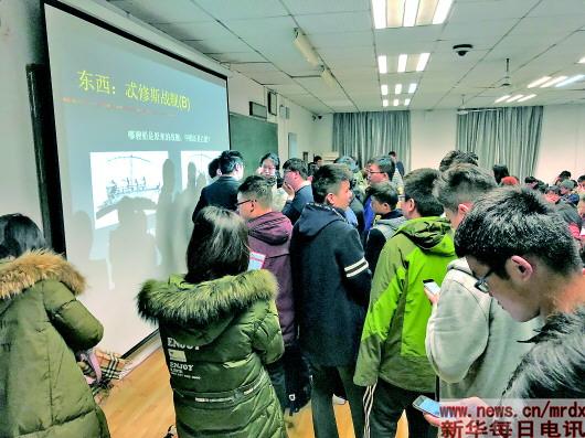 周四晚上7點(diǎn),武漢大學(xué)教5樓的404教室,前門開著,有幾個(gè)學(xué)生站到了走廊里,頭朝教室里面看著;后門也開著,卻也被幾個(gè)站著的學(xué)生堵上了。從走廊踮腳往里看,教室四周站了一圈學(xué)生,手里捧著筆記本;過(guò)道里也坐著學(xué)生,抱著書包,聚精會(huì)神地看向黑板。