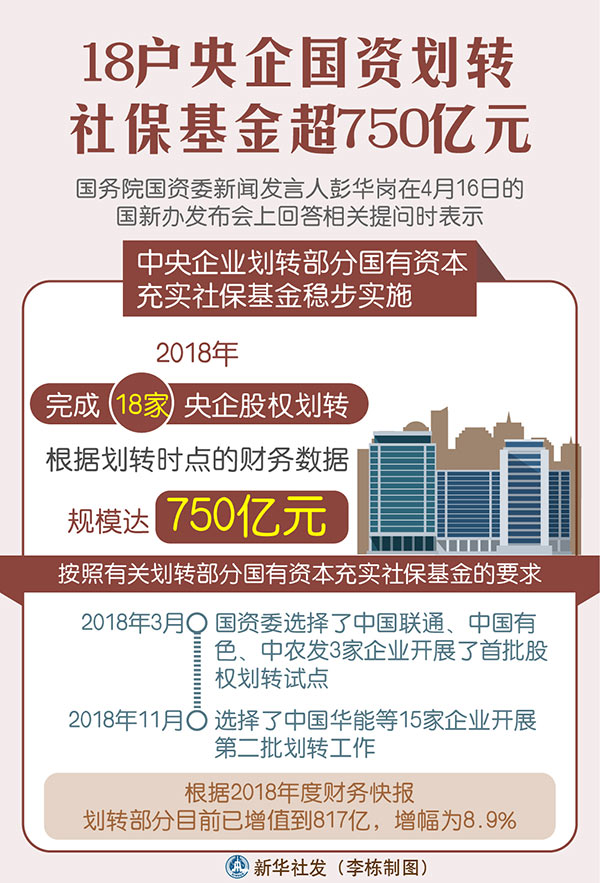 新華社北京4月16日電(記者王希)國務院國資委新聞發(fā)言人彭華崗16日說,中央企業(yè)劃轉部分國有資本充實社?;鸱€(wěn)步實施,2018年完成18家央企股權劃轉,根據劃轉時點的財務數據,規(guī)模達750億元。