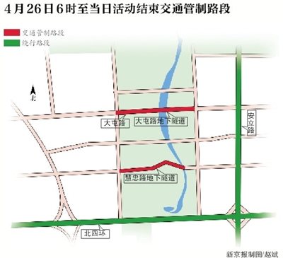 4月23日0時(shí)至4月26日活動(dòng)結(jié)束,由北辰西路與大屯路交叉口(不含)經(jīng)大屯路、天辰西路、大屯北路(不含)、湖景東路、國(guó)家體育場(chǎng)北路、景觀大道、慧忠路、天辰西路至大屯路以內(nèi)區(qū)域道路,除持有“高峰論壇”專用證件的車輛外,禁止其他車輛通行。