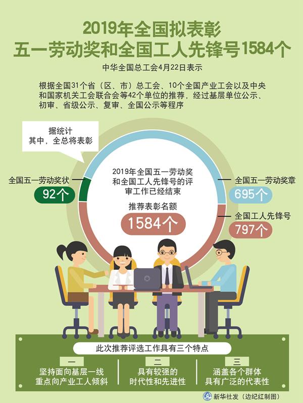 新華社北京4月22日電(記者樊曦)中華全國總工會22日表示,根據(jù)全國31個?。▍^(qū)、市)總工會、10個全國產(chǎn)業(yè)工會以及中央和國家機關(guān)工會聯(lián)合會等42個單位的推薦,經(jīng)過基層單位公示、初審、省級公示、復(fù)審、全國公示等程序,2019年全國五一勞動獎和全國工人先鋒號的評審工作已經(jīng)結(jié)束,推薦表彰名額1584個。