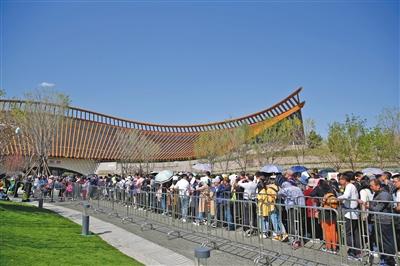 昨日,五一小長假第一天,世園會迎來開園后的首個客流高峰。圖為當日下午三時許,中國館前排隊的游客。新京報記者 侯少卿 攝