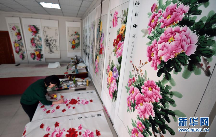 畫師在中國平樂牡丹畫創(chuàng)意園區(qū)進(jìn)行創(chuàng)作(4月25日攝)。新華社記者 李嘉南 攝