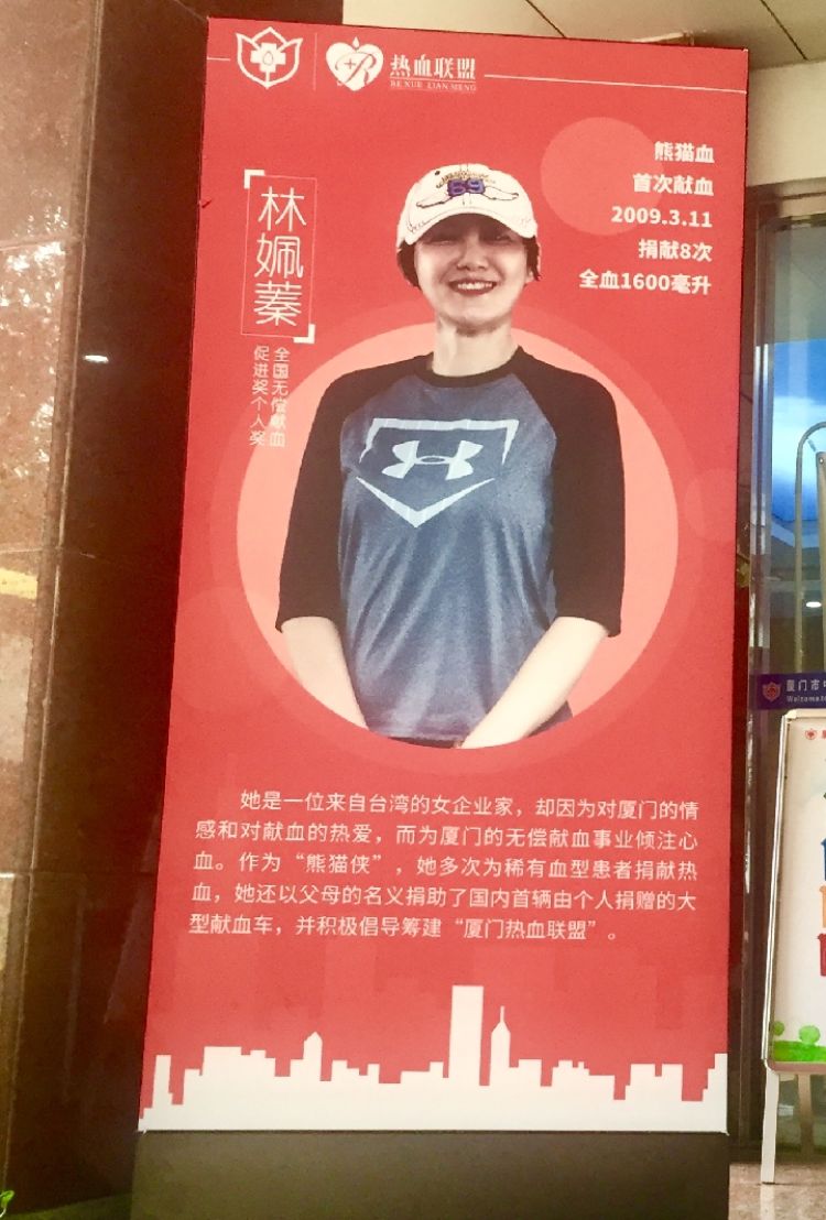 廈門市中心血站展板上宣介的是女臺商林姵蓁。她是Rh陰性血,這種血型因稀有而被稱為“熊貓血”。來自臺北的林姵蓁對無償獻(xiàn)血有一份執(zhí)著和擔(dān)當(dāng),這源于父親獻(xiàn)血幾十次的身教。她志愿成為無償為他人捐獻(xiàn)“熊貓血”的“熊貓俠”,在臺灣每次接到求助電話都會第一時間趕去獻(xiàn)血。