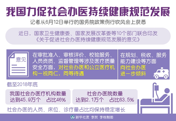 新華社北京6月12日電(記者張泉、屈婷)記者從12日舉行的國務(wù)院政策例行吹風會上獲悉,近日,國家衛(wèi)生健康委、國家發(fā)展改革委等10個部門聯(lián)合印發(fā)《關(guān)于促進社會辦醫(yī)持續(xù)健康規(guī)范發(fā)展的意見》,立足社會辦醫(yī)的定位和發(fā)展方向,在鞏固和加強前期工作的基礎(chǔ)上,又推出一批鼓勵支持政策。