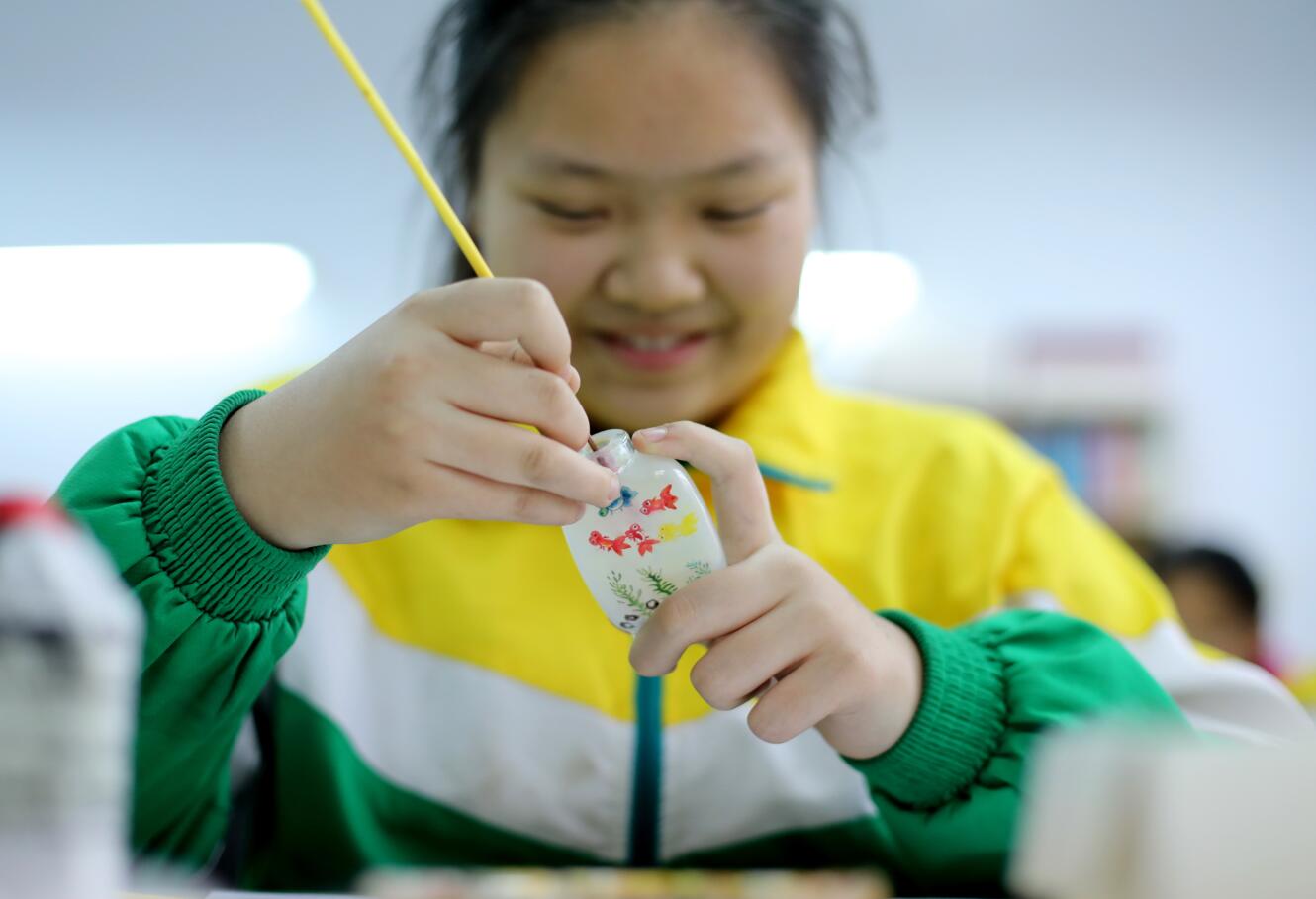 近年來,河北省衡水市珍寶街小學(xué)將當(dāng)?shù)氐膰壹?jí)非物質(zhì)文化遺產(chǎn)項(xiàng)目衡水內(nèi)畫引入校園,開設(shè)校本課程,并成立“內(nèi)畫工藝坊”興趣社團(tuán),在豐富校園文化生活的同時(shí),讓學(xué)生們近距離感受非遺的魅力,弘揚(yáng)和傳承傳統(tǒng)文化。