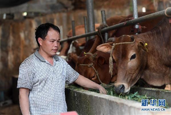 在廣西都安瑤族自治縣隆福鄉(xiāng)隆旺村三叉屯,羅仕林在攪拌飼料準備喂牛(4月24日攝)。新華社記者陸波岸 攝