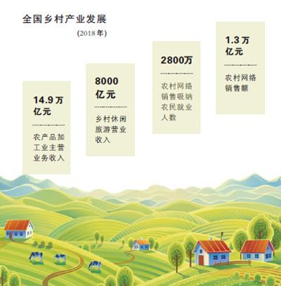 產業(yè)興旺是鄉(xiāng)村振興的基礎,是解決農村問題的前提。黨的十八大以來,鄉(xiāng)村產業(yè)呈現(xiàn)良好發(fā)展勢頭。2018年,糧食產能連續(xù)7年保持在1.2萬億斤以上,農產品加工業(yè)主營業(yè)務收入達14.9萬億元,鄉(xiāng)村休閑旅游營業(yè)收入超過8000億元,農業(yè)生產性服務業(yè)營業(yè)收入超過2000億元,農村網絡銷售額1.3萬億元,返鄉(xiāng)下鄉(xiāng)創(chuàng)新創(chuàng)業(yè)人員累計達780萬。