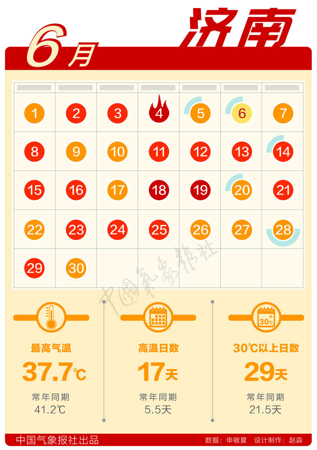 濟(jì)南:6月,濟(jì)南市區(qū)共出現(xiàn)17個(gè)高溫日,位列歷史同期第二位,第一位是1955年22個(gè)高溫日。最高氣溫37.7℃,與有記錄以來濟(jì)南市區(qū)6月最高氣溫41.2(2009年6月25日)還差一點(diǎn)。6月35℃以上高溫日數(shù)也未突破歷史極值,但30天中有29天都是30℃以上。