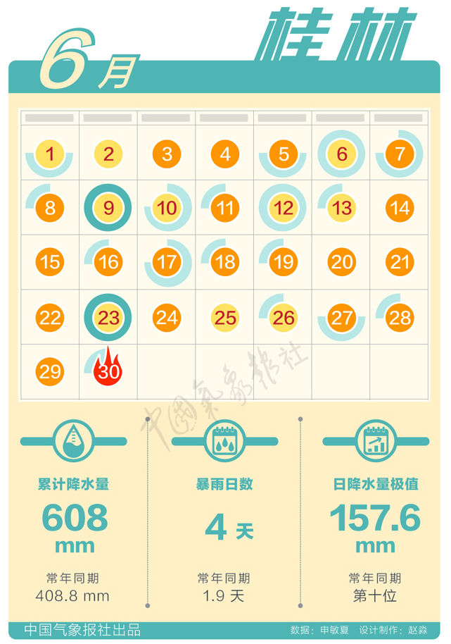 桂林:6月累計(jì)雨量大達(dá)608毫米,而且暴雨日數(shù)多,同時(shí)極端性很強(qiáng)。6月6日83.7毫米的日降水量、6月9日157.6毫米的日降水量、6月12日76.2毫米的日降水量,均打破同期歷史記錄極值。6月23日101.5毫米日降水量位居歷史第二。