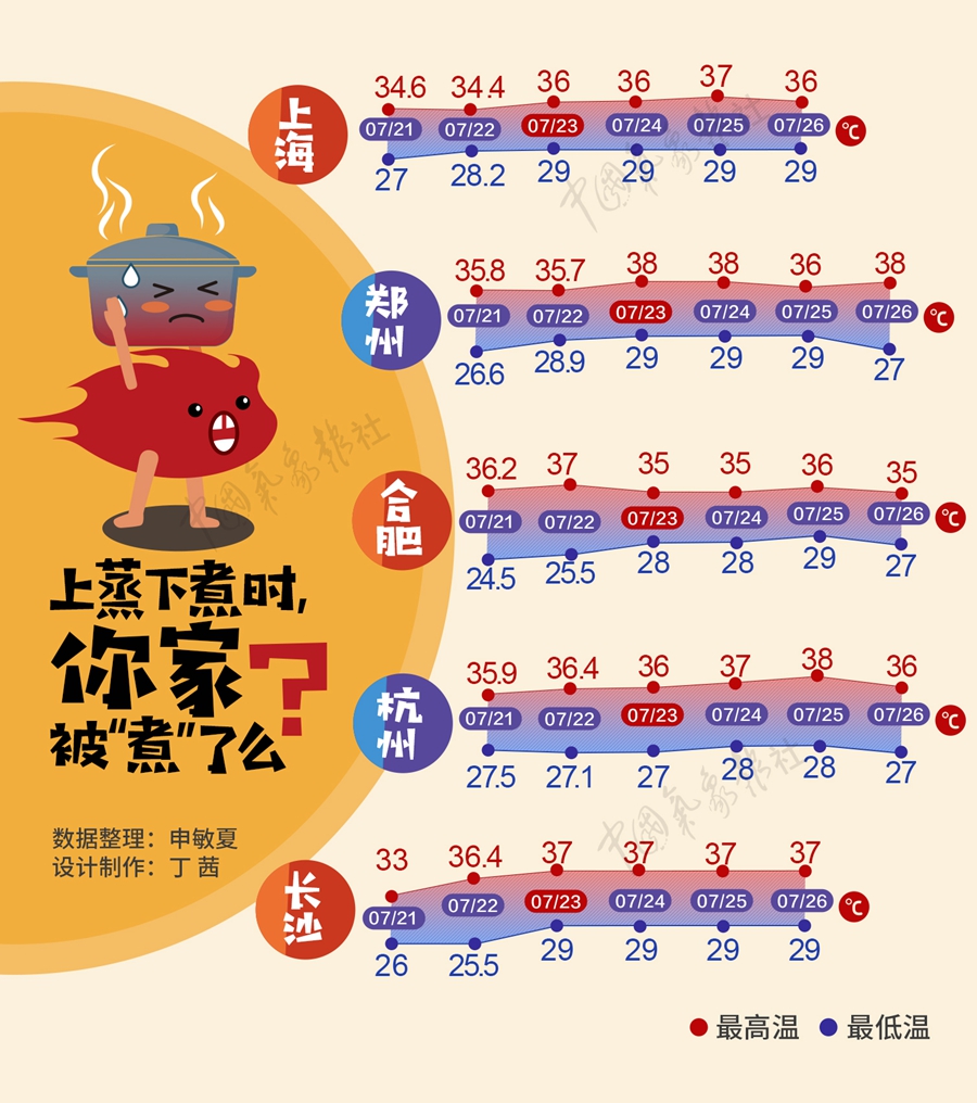 其中,鄭州、合肥、南京、上海、長沙、南昌等地不僅最高氣溫超過35℃,持續(xù)5天至7天,而且最低氣溫也在28℃、29℃,夜間炎熱絲毫沒有緩和,可謂火力十足。