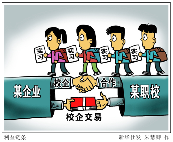 業(yè)內(nèi)人士認(rèn)為,一些職業(yè)學(xué)校將學(xué)生隨意送到一些與專業(yè)無(wú)關(guān)的企業(yè)實(shí)習(xí),甚至以此牟利,這背離了職業(yè)教育的初衷。教育、人社等主管部門(mén)應(yīng)加大對(duì)職校實(shí)習(xí)的監(jiān)管力度,斬?cái)嗦毿?shí)習(xí)背后的利益鏈條,防止“校企合作”成為“校企交易”。