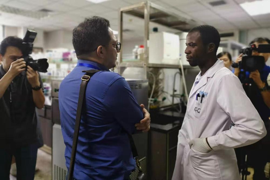 來自喀麥隆的阿諾德(右一)在病原微生物與免疫學(xué)重點(diǎn)實(shí)驗(yàn)室從事博士后研究,他在向外國媒體記者介紹自己的工作。(王曉亮攝)