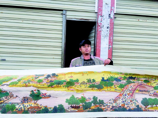 七米多長(zhǎng)的刺繡,要三個(gè)人一起拿著才能全部展示,上面的人物栩栩如生。吳琰花了三年時(shí)間,用了72種不同顏色的線,繡成了這幅有400多個(gè)人物形象的十字繡?!皹蜻@個(gè)地方最難繡,人流太密集,光這一小段就花了三個(gè)多月時(shí)間?!彼钢汤C上那座人流如織的大橋說(shuō)。