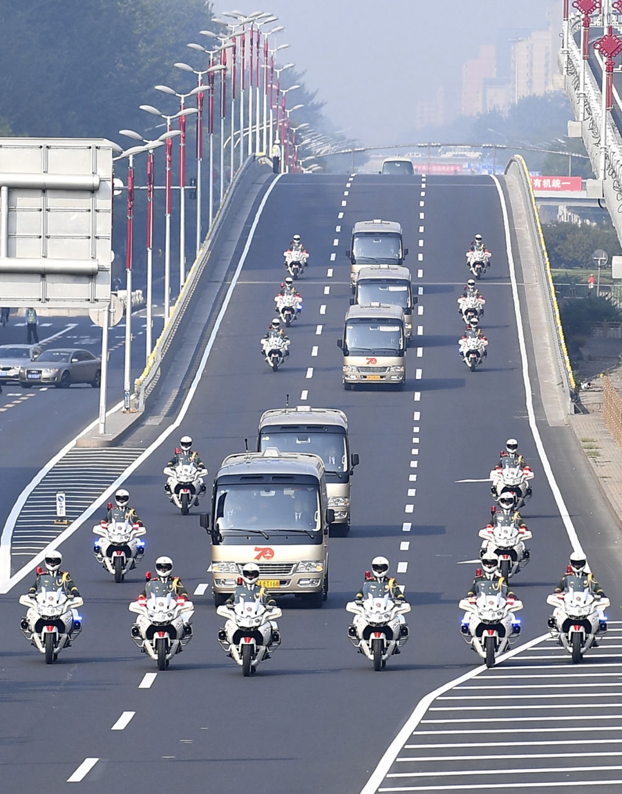 29日上午,國(guó)家勛章和國(guó)家榮譽(yù)稱號(hào)獲得者集體乘坐禮賓車從住地出發(fā),在英姿颯爽的國(guó)賓護(hù)衛(wèi)隊(duì)護(hù)衛(wèi)下,匯成一列車隊(duì),向人民大會(huì)堂進(jìn)發(fā)。