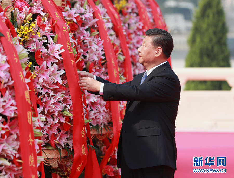 9月30日上午,習(xí)近平、李克強(qiáng)、栗戰(zhàn)書(shū)、汪洋、王滬寧、趙樂(lè)際、韓正、王岐山等黨和國(guó)家領(lǐng)導(dǎo)人來(lái)到北京天安門(mén)廣場(chǎng),出席烈士紀(jì)念日向人民英雄敬獻(xiàn)花籃儀式。這是習(xí)近平整理花籃上的緞帶。 新華社記者 龐興雷 攝