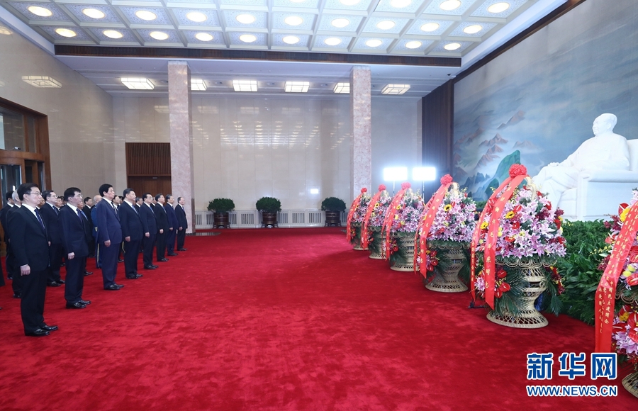 敬獻(xiàn)花籃儀式前,習(xí)近平、李克強(qiáng)、栗戰(zhàn)書(shū)、汪洋、王滬寧、趙樂(lè)際、韓正、王岐山等領(lǐng)導(dǎo)同志來(lái)到毛主席紀(jì)念堂。北大廳內(nèi),中共中央,全國(guó)人大常委會(huì),國(guó)務(wù)院,全國(guó)政協(xié),中央軍委,各民主黨派、全國(guó)工商聯(lián)和無(wú)黨派愛(ài)國(guó)人士敬獻(xiàn)的花籃擺放在毛澤東同志坐像正前方。習(xí)近平等向毛澤東同志坐像三鞠躬,隨后來(lái)到瞻仰廳,瞻仰毛澤東同志遺容,表達(dá)對(duì)毛澤東同志等老一輩革命家的深切緬懷。