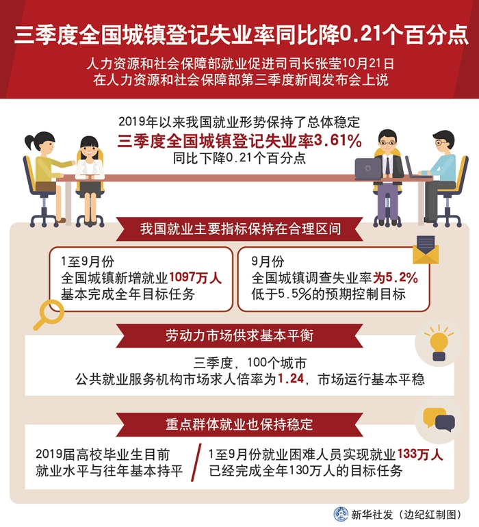 新華社北京10月21日電(記者王優(yōu)玲)人力資源和社會(huì)保障部就業(yè)促進(jìn)司司長(zhǎng)張瑩21日說,今年以來我國(guó)就業(yè)形勢(shì)保持了總體穩(wěn)定,三季度全國(guó)城鎮(zhèn)登記失業(yè)率3.61%,同比下降0.21個(gè)百分點(diǎn)。