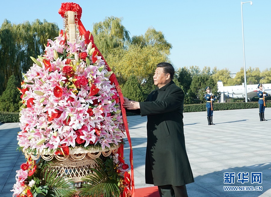 11月8日,中共中央總書記、國家主席、中央軍委主席習(xí)近平出席慶??哲姵闪?0周年主題活動,代表黨中央和中央軍委,對空軍成立70周年表示熱烈祝賀,向空軍全體官兵致以誠摯問候。這是習(xí)近平來到位于北京市昌平區(qū)的中國航空博物館,向人民空軍英烈敬獻(xiàn)花籃。 新華社記者 李剛 攝