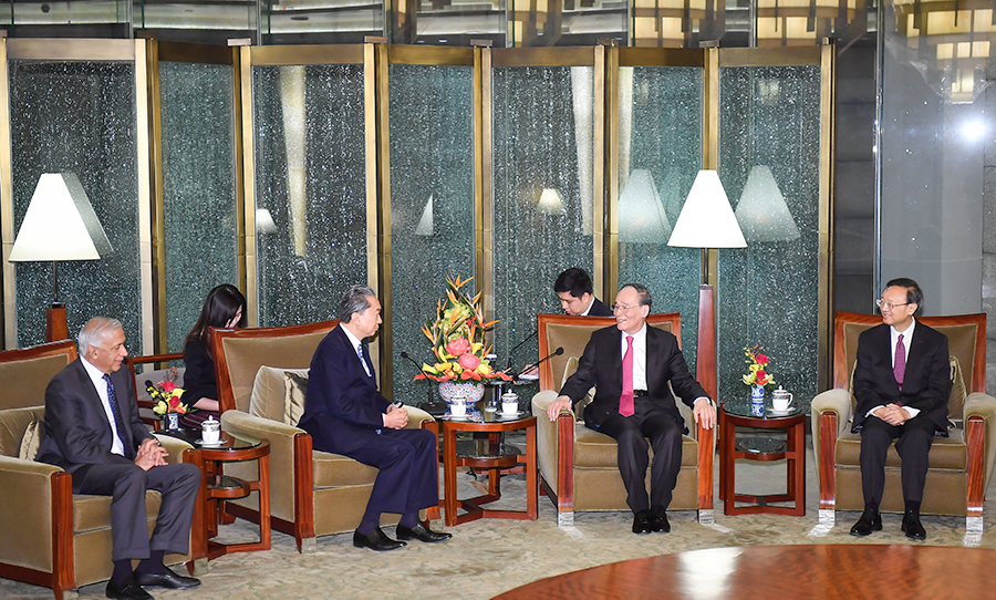 12月16日,國家副主席王岐山在北京釣魚臺國賓館會見出席紀念中國人民外交學會成立70周年招待會的日本前首相鳩山由紀夫等外國前政要和駐華使節(jié)代表。新華社記者 李響 攝