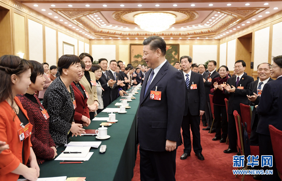 3月8日,中共中央總書(shū)記、國(guó)家主席、中央軍委主席習(xí)近平參加十三屆全國(guó)人大二次會(huì)議河南代表團(tuán)的審議。在“三八”國(guó)際勞動(dòng)?jì)D女節(jié)到來(lái)之際,習(xí)近平代表黨中央,向參加全國(guó)兩會(huì)的女代表、女委員、女工作人員,向全國(guó)各族各界婦女,致以節(jié)日的祝賀和美好的祝福。這是習(xí)近平同女代表親切交談。新華社記者 李學(xué)仁 攝