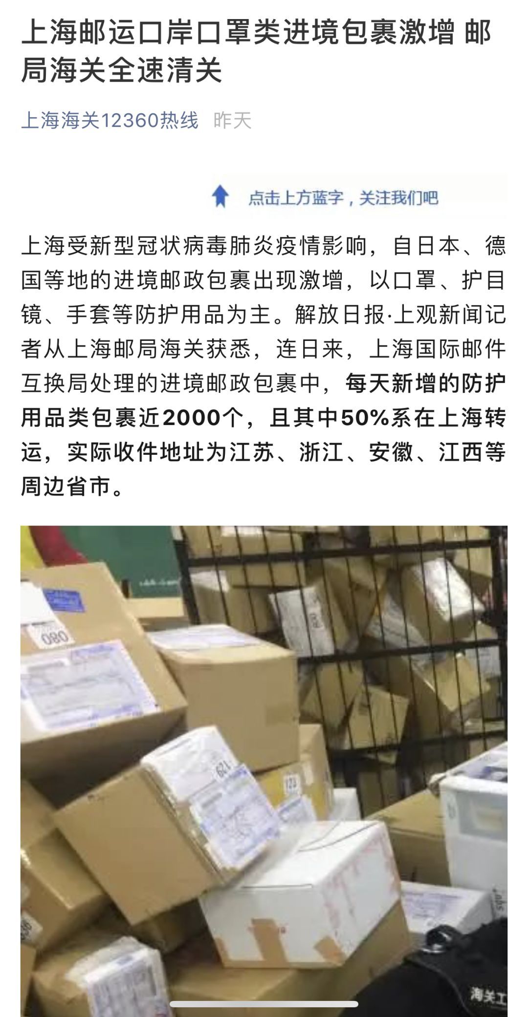 海關(guān)總署1月27日發(fā)出通知,對聲明涉及疫情物資的郵件快件,可以采取個案處理方式,優(yōu)先辦理報關(guān)手續(xù)。為加速進出境郵件中口罩、護目鏡、手套等肺炎疫情防護用品的清關(guān)速度,上海郵局海關(guān)對外公布春節(jié)期間24小時聯(lián)系電話:021-56355716。相關(guān)防護用品郵件的寄收件人如有需求,可致電詳細報告郵件號碼,海關(guān)將即時進行快速驗放。