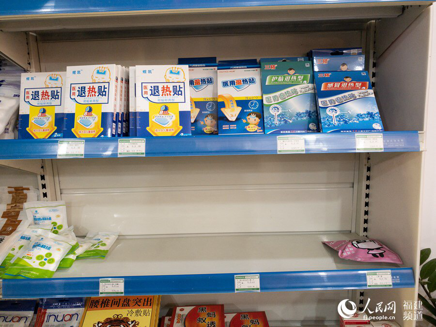 “一罩難求?!庇浾咦咴L了南靖縣多家藥店,都聽到了同樣的說法。在一些藥店,除了醫(yī)用口罩以外,連酒精、消毒液、感冒藥、溫度計等也都售空。