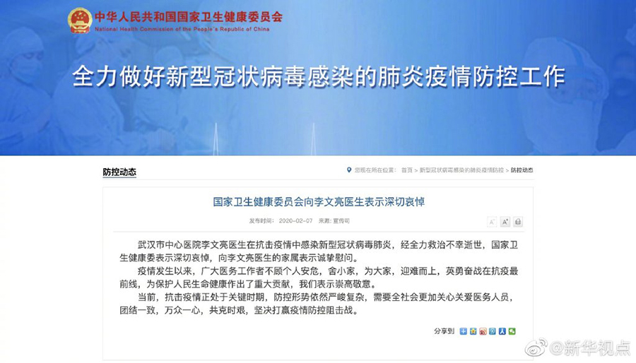 武漢市中心醫(yī)院李文亮醫(yī)生在抗擊疫情中感染新型冠狀病毒肺炎,經(jīng)全力救治不幸逝世,國家衛(wèi)生健康委表示深切哀悼,向李文亮醫(yī)生的家屬表示誠摯慰問。