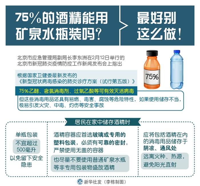 新華社北京2月13日電(記者丁靜)越來(lái)越多的人選擇常備75%的乙醇(俗稱(chēng)酒精)進(jìn)行家庭和個(gè)人消毒。那么,75%的乙醇可以裝在礦泉水瓶里嗎?北京市應(yīng)急管理局副局長(zhǎng)李東洲在12日舉行的北京市新冠肺炎疫情防控工作新聞發(fā)布會(huì)上稱(chēng),最好別這么做。