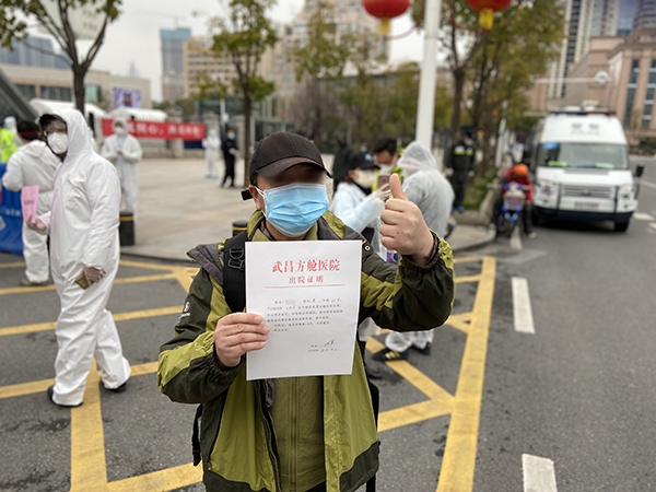2月11日,在方艙治療5天后,許峰等來了期待已久的好消息:胸部CT檢測合格,兩次核酸檢測陰性。經(jīng)湘雅二醫(yī)院和湖北省腫瘤醫(yī)院專家團(tuán)隊(duì)評估后,許峰有幸成為了第一批從武昌方艙醫(yī)院出艙的28名患者之一。