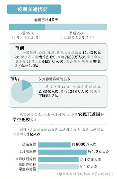 從客流類型看,未來(lái)一段時(shí)間,主要是農(nóng)民工返崗客流和學(xué)生返??土?,公務(wù)商務(wù)客流較少、旅游客流很少。預(yù)計(jì)2月底前客流以農(nóng)民工返崗流為主,2月底前將迎來(lái)學(xué)生返??土鳌?/p>