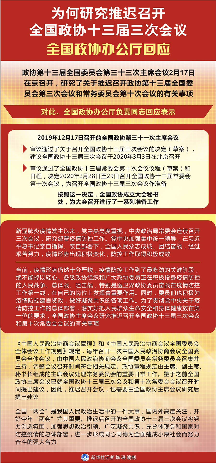 新華社北京2月17日電 政協(xié)第十三屆全國委員會第三十三次主席會議17日在京召開,研究了關(guān)于推遲召開政協(xié)第十三屆全國委員會第三次會議和常務(wù)委員會第十次會議的有關(guān)事項。對此,全國政協(xié)辦公廳負責同志回應(yīng)表示,2019年12月17日召開的全國政協(xié)第三十一次主席會議,審議通過了關(guān)于召開全國政協(xié)十三屆三次會議的決定(草案),建議全國政協(xié)十三屆三次會議于2020年3月3日在北京召開;審議通過了全國政協(xié)十三屆常委會第十次會議議程(草案)和日程,決定2020年2月28日至29日召開全國政協(xié)十三屆常委會第十次會議,為召開全國政協(xié)十三屆三次會議作準備。按照這一決定,全國政協(xié)成立大會秘書處,為大會召開進行了一系列準備工作。