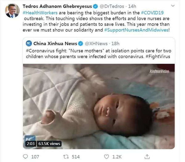 ↑世界衛(wèi)生組織總干事譚德塞轉(zhuǎn)發(fā)新華社海外社交媒體英文主賬號稿件《隔離點里的“臨時媽媽”》,贊譽(yù)中國醫(yī)護(hù)人員在新冠肺炎防治工作中付出的努力和愛心。