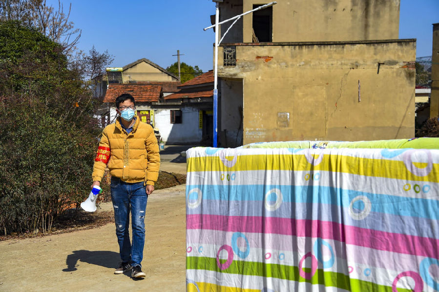 志愿者程浩在村莊來(lái)回播放錄音,提示村民注意防護(hù)。新華社記者 胡虎虎 攝