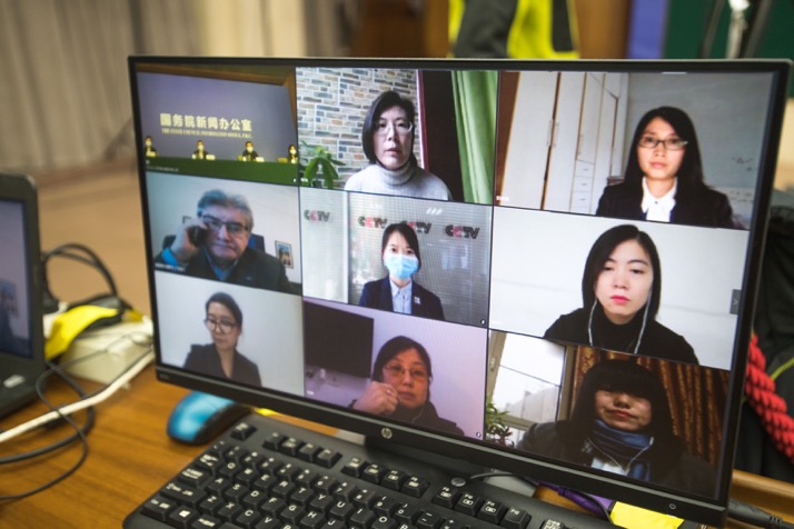 記者通過視頻連線提問。新華社記者肖藝九攝。