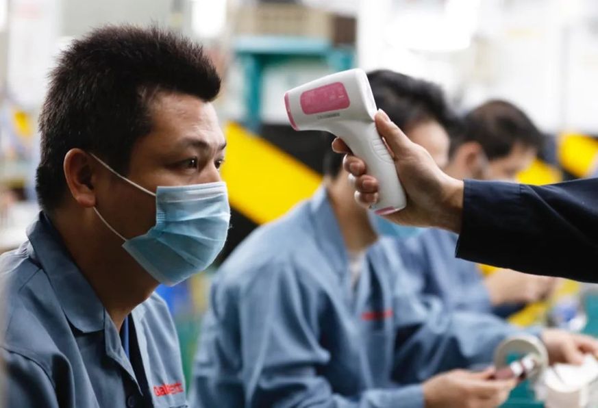 2月10日,廣東格蘭仕集團(tuán)有限公司順德總部車間生產(chǎn)線上的員工測體溫。新華社記者 黃國保 攝