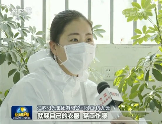 江蘇陽光集團(tuán)有限公司員工 杭九云:完全不一樣,我們平時干活的話,就穿自己的工作服,穿廠服就好了,現(xiàn)在來了,要穿這個密不透風(fēng),我感覺醫(yī)生還要比我們不容易,他們還要去救人,其實他們比我們還要更累,所以堅持吧。